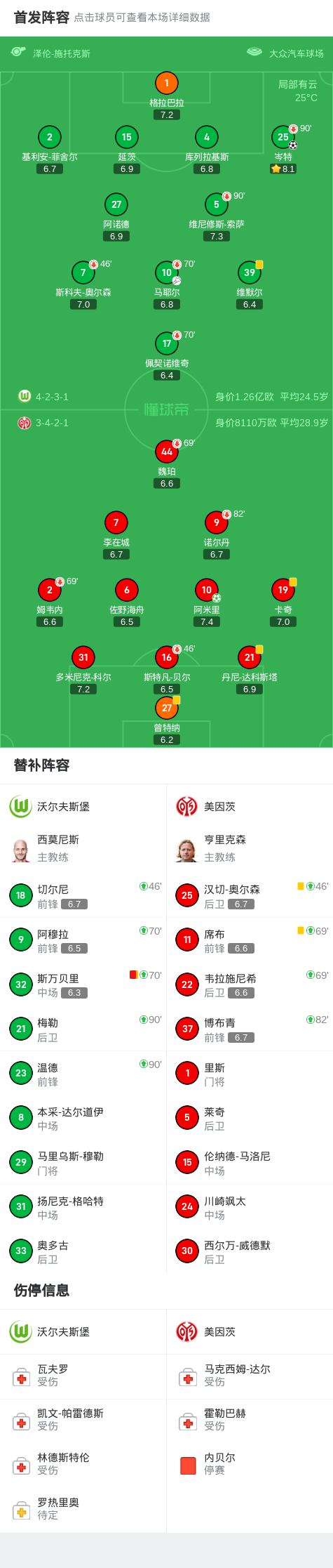 BSPORTS-沃尔夫斯堡1-1美因茨,岑特先拔头筹,阿米里扳平比分